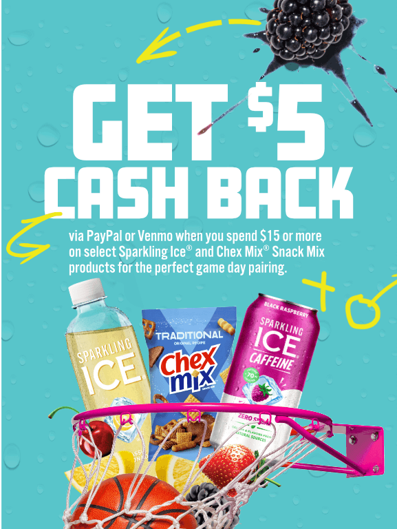 Valid 03/01/26 – 03/31/26. Purchase $15 or more in combined Sparkling Ice® beverages and qualifying Chex Mix® products in a single transaction and receive a $5 cashback rebate. U.S. residents 18+ only. Receipt must be uploaded by 04/07/26. Limit 1 per person. Venmo® or PayPal® account required (free to create; subject to their terms). Void where prohibited. Full terms and qualifying products (including UPCs): SparklingIceRebates.com/rebateterms.